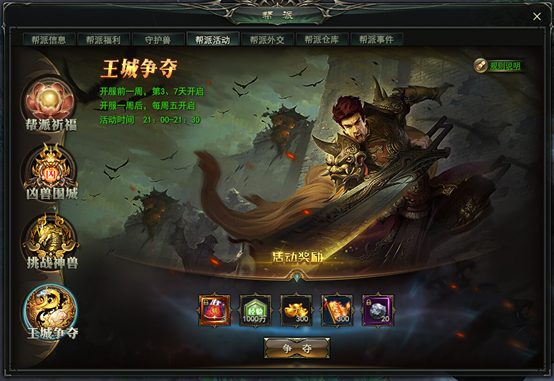 王城争夺:与其他帮派对王城进行争夺,获胜方将成为王城的占领者,下次王城战时将抵御其他所有帮派的进攻;进攻方需要打碎王座方可获得胜利,防守方需保护王座不被打碎;防守如果连续卫冕,则进攻方将获得属性加成。