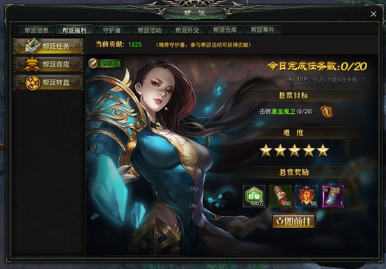 帮派任务:消耗帮派贡献可接取帮派悬赏任务,完成后可获得奖励。
