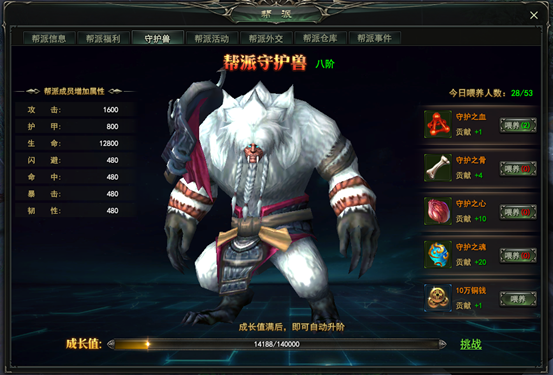 守护神玩法,帮派成员齐心喂养守护神,守护神可为全体帮派成员带来属性加成,等阶越高,加成越多。