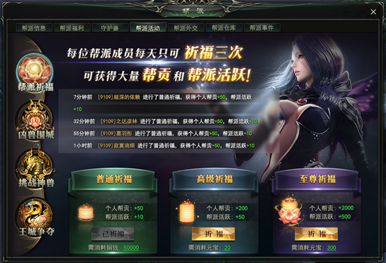 帮派祈福:消耗铜钱或元宝对帮派进行祈福,可增加帮派活跃度和获得个人帮贡。